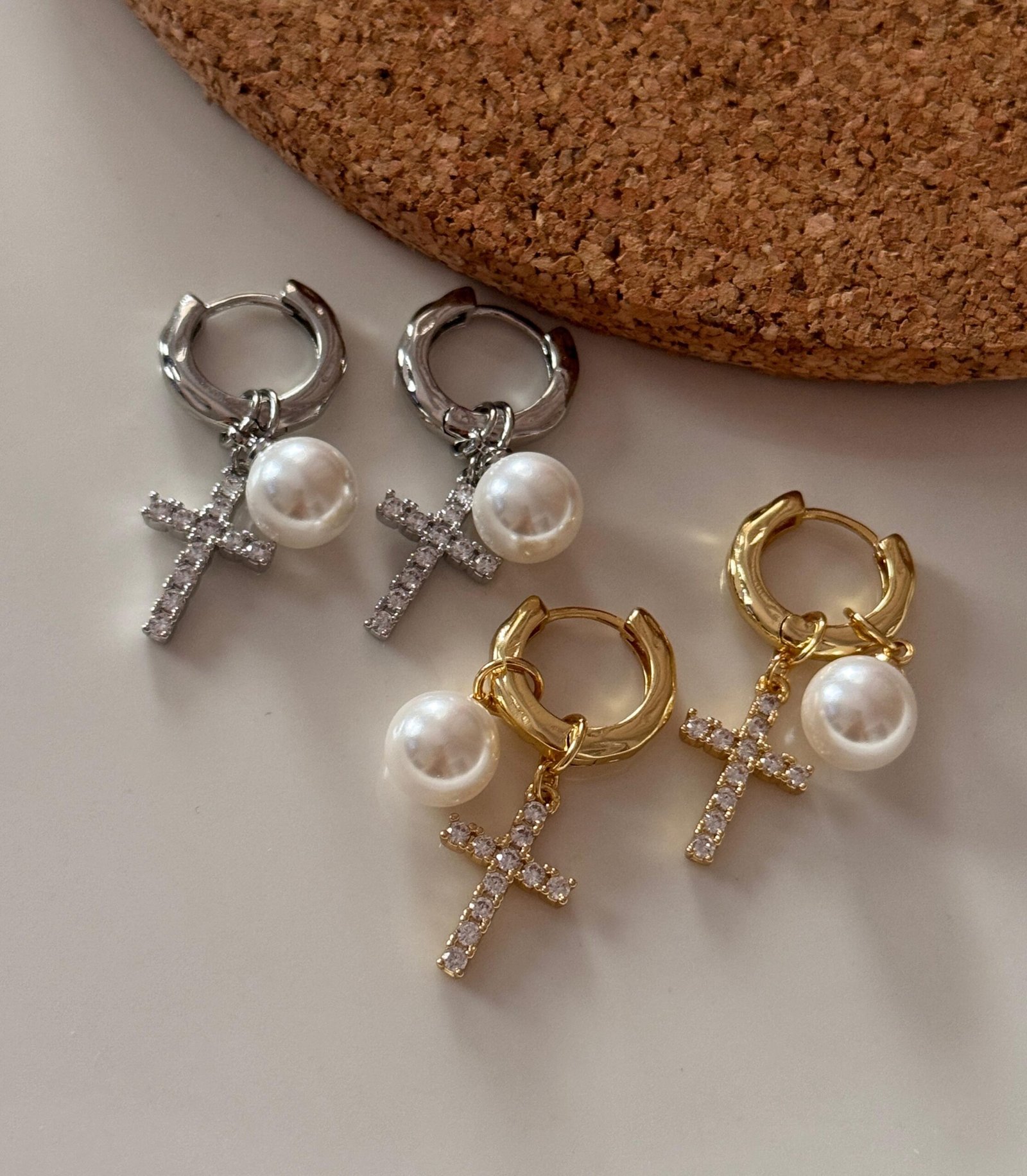 Dijes desmontables: Perla sintética y Cruz de circonias incrustadas.